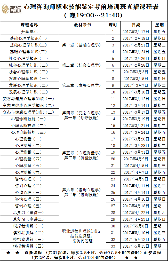 1、培訓時間:2017年2月17日開始上課,每周日、二、五上課(上課時間:19:00-21:40,課間休息10分鐘),共32次,每次2.5小時;復習集中面授兩天,地點另行通知。