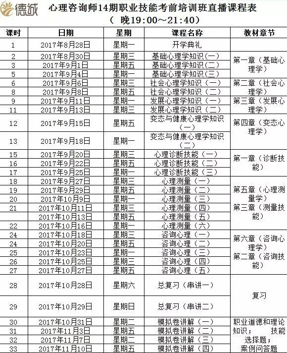 2017年8月28日-11月10日,每周一、三、五上課(上課時間:19:00-21:40,課間休息10分鐘),共33次,每次2.5小時;復習集中面授兩天,地點另行通知。