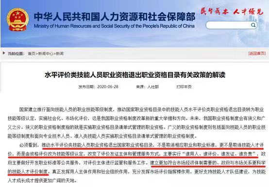 根據政府“放管服”和對技能人員評價制度進行深度改革的要求,2020年人社部發布《關于做好水平評價類技能人員職業資格退出目錄有關工作的通知》,公布將于2020年12月31日前將水平評價類技能人員職業資格分批有序退出目錄。然而,人社部同時一再強調,推動水平評價類技能人員職業資格退出國家職業資格目錄,不是取消相應職業和職業標準,更不是取消技能人才評價。只是由資格評價改為技能等級認定,改變了評價發證主體和管理服務方式,實行“誰用人、誰評價、誰發證、誰負責”,真正發揮用人主體作用和社會組織作用,為技能人才成長成才提供更加廣闊的天地。