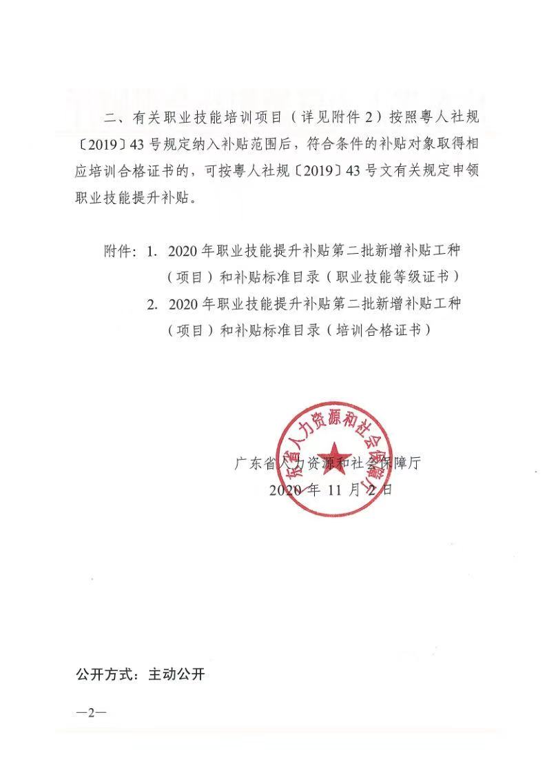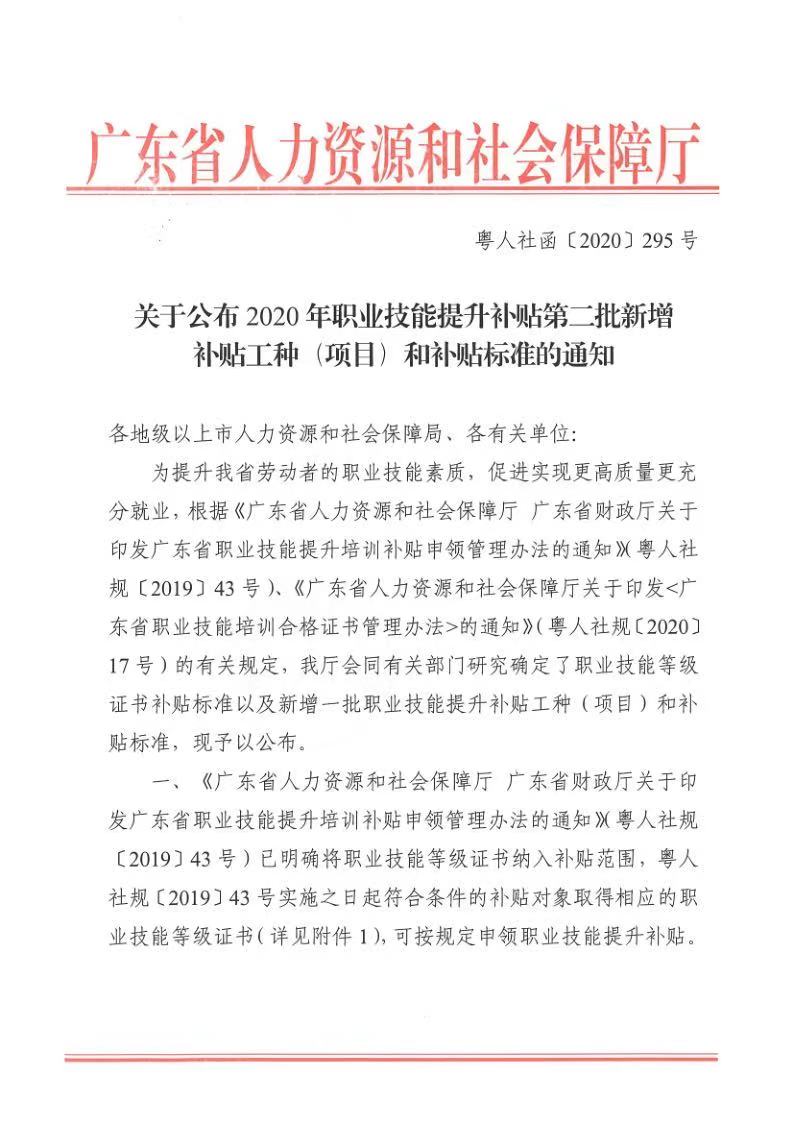 2. 截選《關于公布2020年職業技能提升補貼第二批新增補貼工種(項目)和補貼標準的通知》粵人社函[2020]295號文