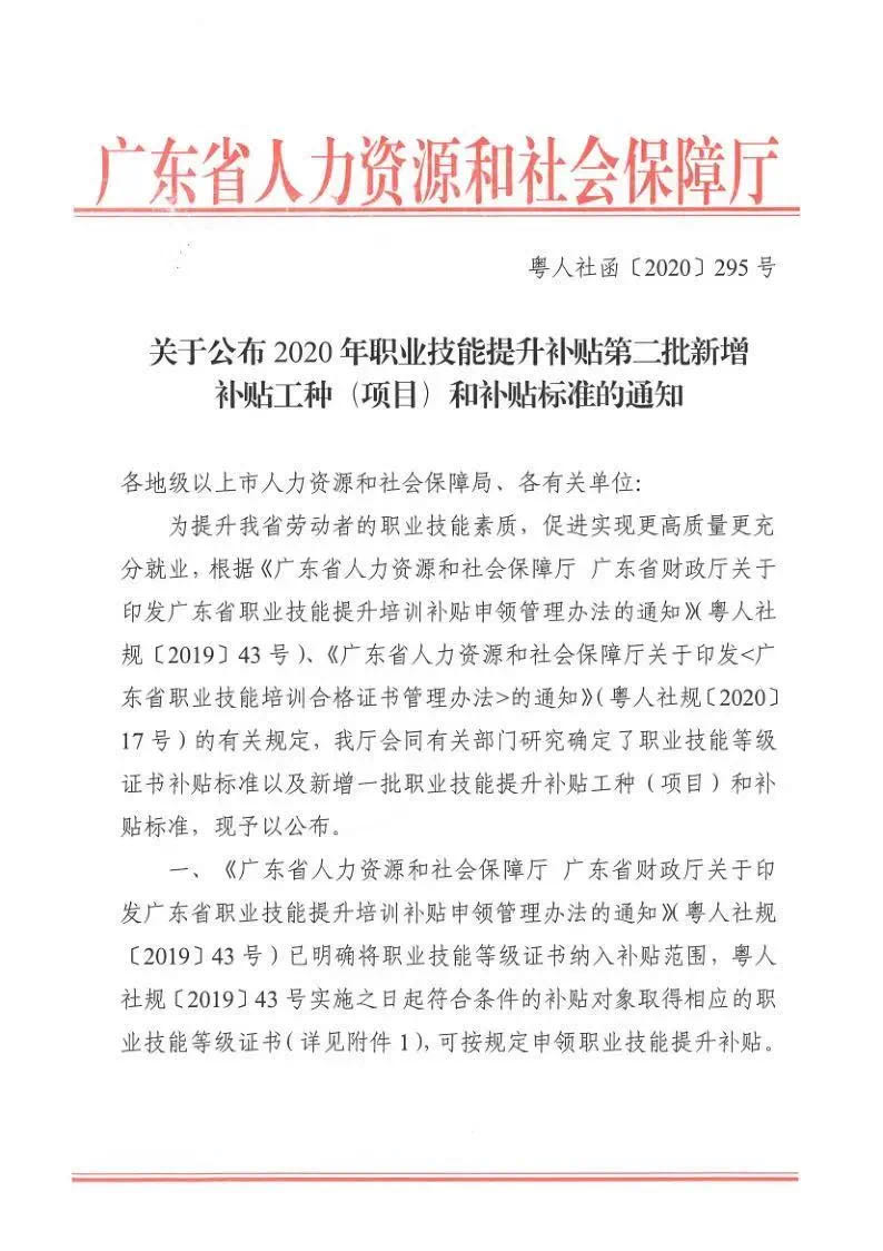 2. 截選《關于公布2020年職業技能提升補貼第二批新增補貼工種(項目)和補貼標準的通知》粵人社函[2020]295號文