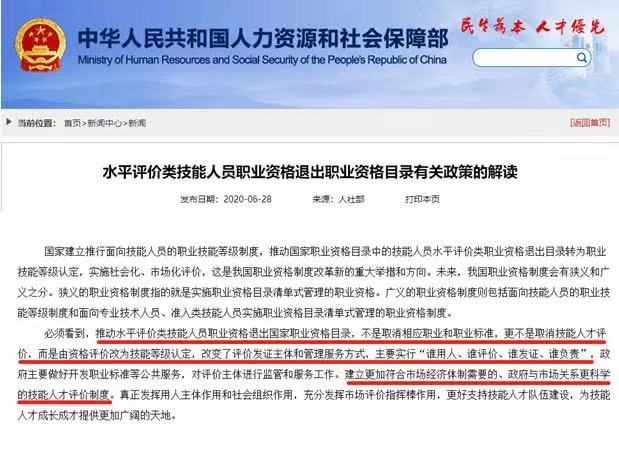 根據(jù)政府“放管服”和對(duì)技能人員評(píng)價(jià)制度進(jìn)行深度改革的要求,2020年人社部發(fā)布《關(guān)于做好水平評(píng)價(jià)類技能人員職業(yè)資格退出目錄有關(guān)工作的通知》,公布將于2020年12月31日前將水平評(píng)價(jià)類技能人員職業(yè)資格分批有序退出目錄。然而,人社部同時(shí)一再強(qiáng)調(diào),推動(dòng)水平評(píng)價(jià)類技能人員職業(yè)資格退出國家職業(yè)資格目錄,不是取消相應(yīng)職業(yè)和職業(yè)標(biāo)準(zhǔn),更不是取消技能人才評(píng)價(jià)。只是由資格評(píng)價(jià)改為技能等級(jí)認(rèn)定,改變了評(píng)價(jià)發(fā)證主體和管理服務(wù)方式,實(shí)行“誰用人、誰評(píng)價(jià)、誰發(fā)證、誰負(fù)責(zé)”,真正發(fā)揮用人主體作用和社會(huì)組織作用,為技能人才成長成才提供更加廣闊的天地。