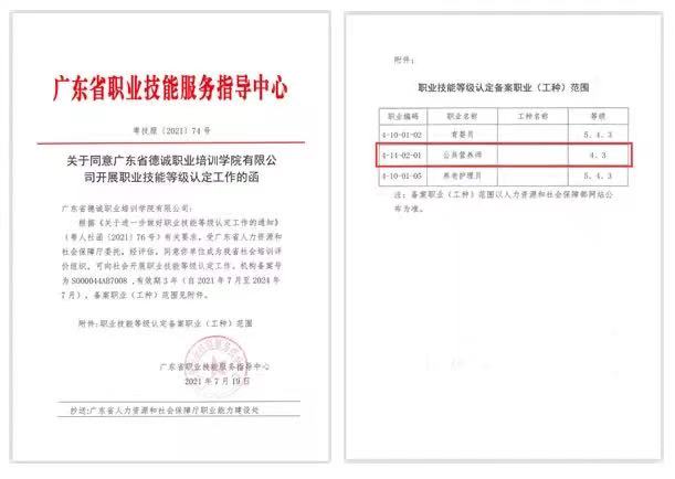 廣東省德誠職業(yè)培訓(xùn)學(xué)院有限公司很榮幸成為廣東省人力資源和社會(huì)保障廳2021年首批社會(huì)培訓(xùn)評(píng)價(jià)組織之一,可自行開展培訓(xùn)和評(píng)價(jià)考核工作。