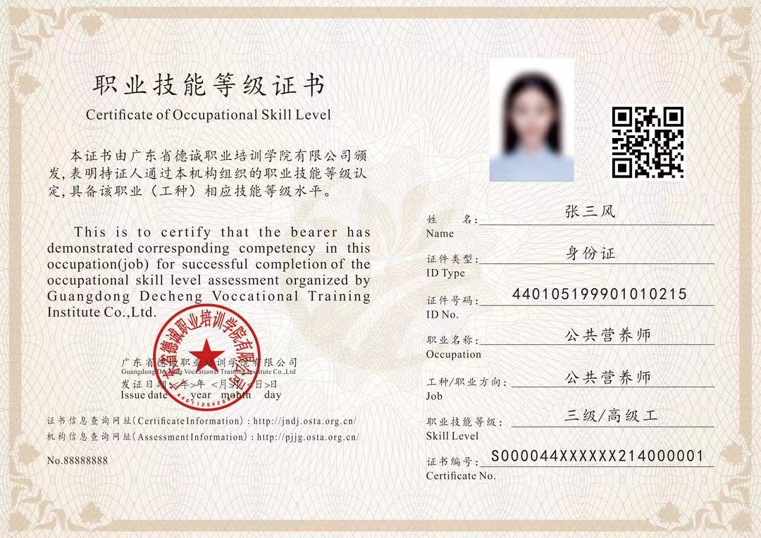 考核合格者,頒發廣東省德誠職業培訓學院有限公司簽章的“公共營養師職業技能等級證書”。該證書可以作為就業、升職、加薪等的憑證。