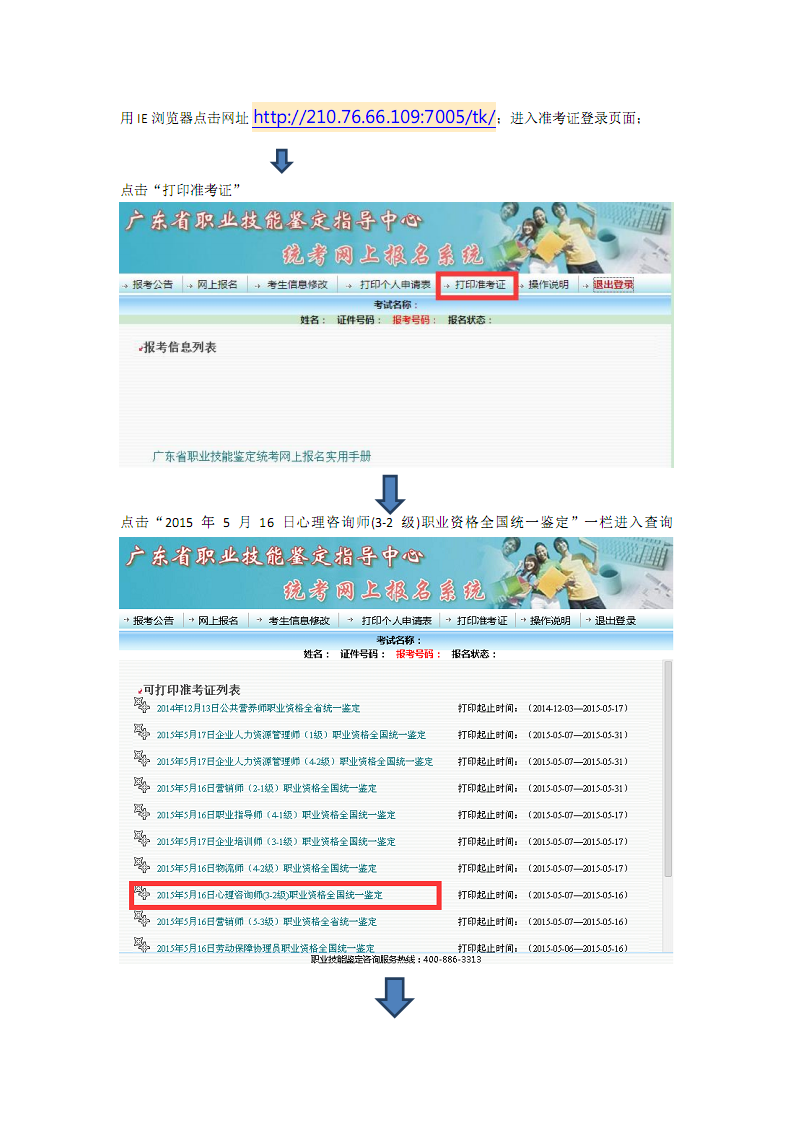 2015年5月13日心理咨詢師鑒定考試準考證打印流程