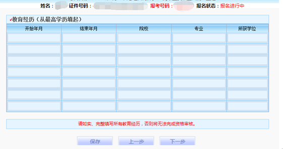 第十步:填完教育經歷后點擊 保存,然后點擊 下一步,進入頁面如下: