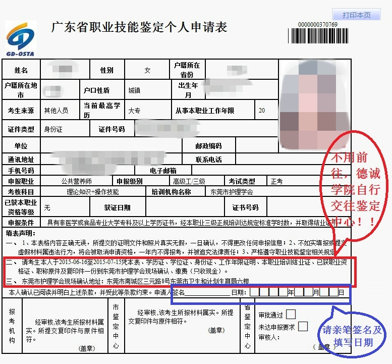 注意:其中申請表的填表申明處的第三項是東莞市護理學會現場確認地址。我們機構廣東省德誠培訓學院,在收齊大家的資料后會統一幫大家交到東莞鑒定中心,大家無須前往護理學會,謝謝!