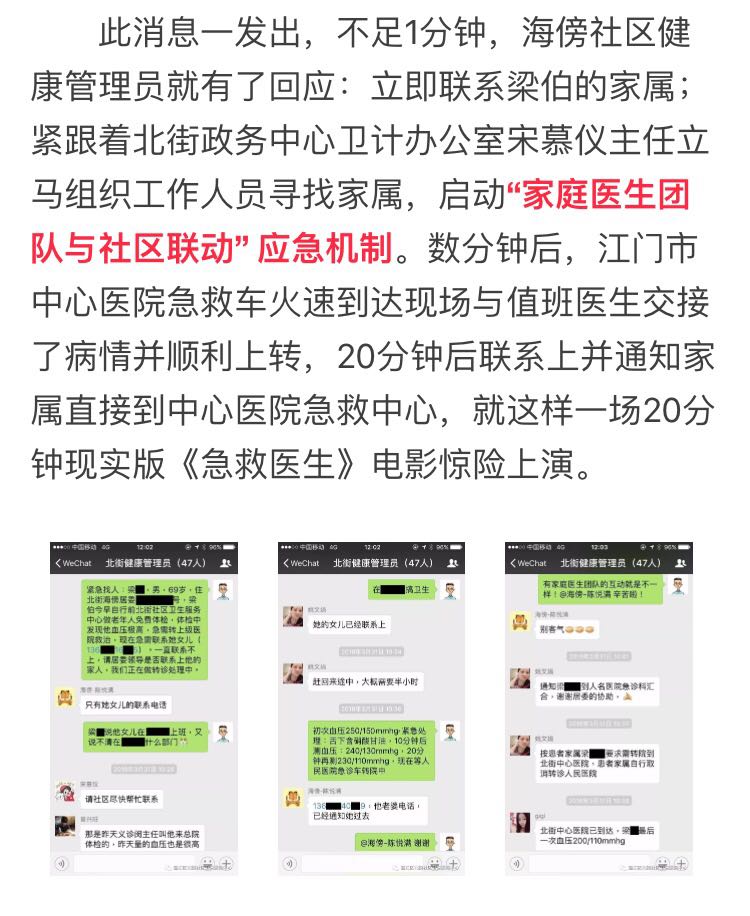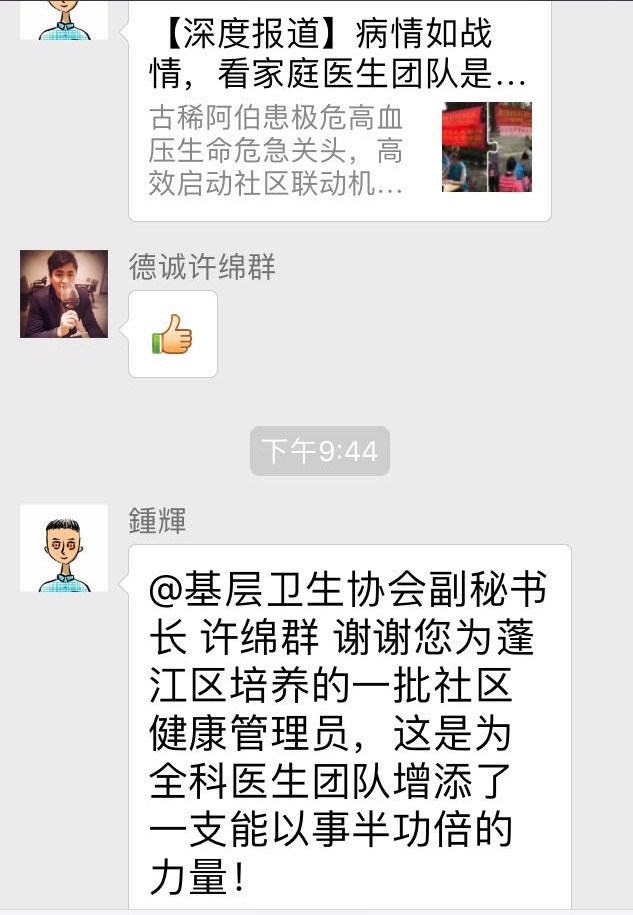 近日,蓬江區社區衛生服務中心鐘輝主任給德誠學院許綿群院長發來一篇題為“深度報道:病情如戰情,看家庭醫生團隊是如何做到的”一文,并附言道:謝謝您為蓬江區培養的一批社區健康管理員,這是為全科醫生團隊增添了一支能以事半功倍的力量!