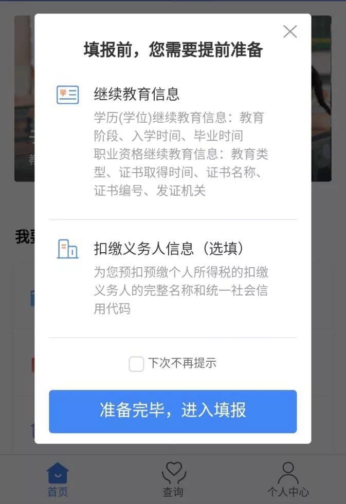 如果這些數據你都準備了那就可以點擊下方的按鈕"準備完畢,進入填報",如果不希望下次彈出,還可以勾選"下次不再提醒"。