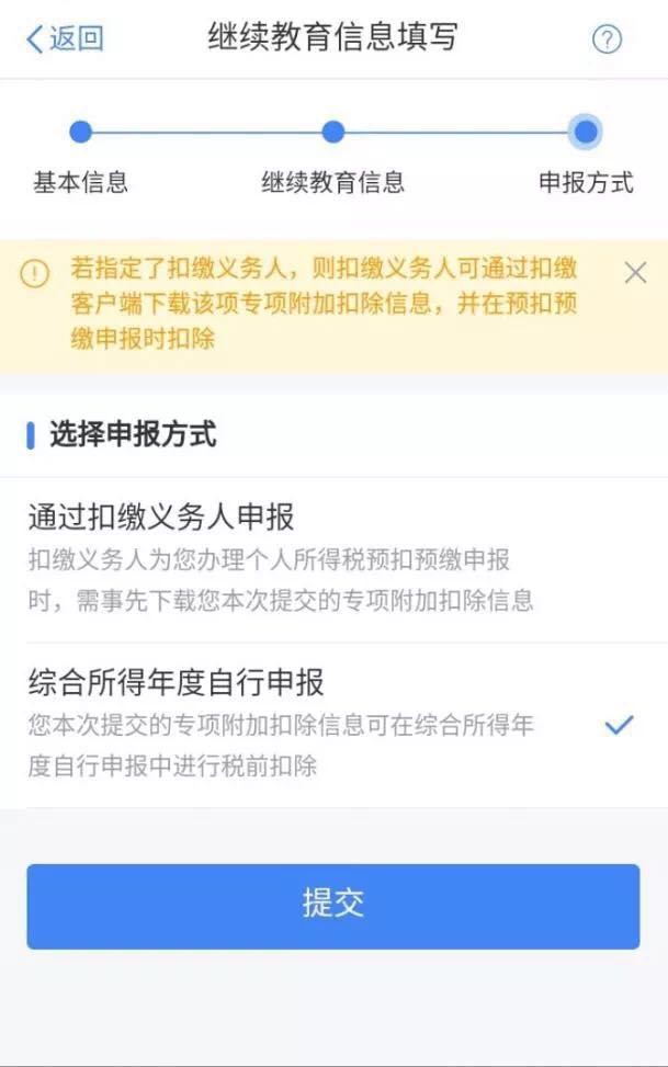 綜合所得年度自行申報:這一項就是每年的某段時間自己去稅務局辦事大廳去申報。如果你的有些個人信息不想讓公司知道,那你就年底自己去柜臺辦。勾選這個后,然后再點擊下方的"提交"按鈕。