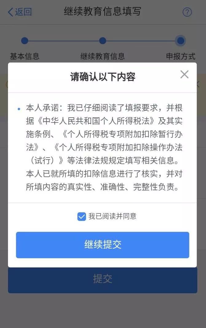 第六步:在上一步點擊"提交"后就會進入到如下圖的信息確認提示頁面,其中列舉了本次專項信息扣除所依據的法律法規。大家閱讀完成后就可以勾選"我已閱讀并同意",然后點擊"繼續提交"。