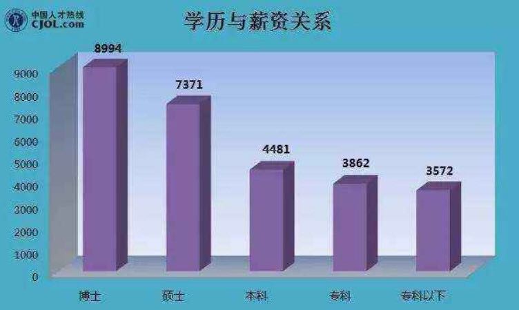 這是一份關于學歷與薪資的調查,從這幅圖可以看出,學歷與薪資成正比,學歷越高,薪資相應增長,反之,薪資相應遞減。
