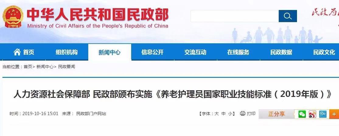 人社部、民政部頒布實(shí)施《養(yǎng)老護(hù)理員國(guó)家職業(yè)技能標(biāo)準(zhǔn) (2019年版)》