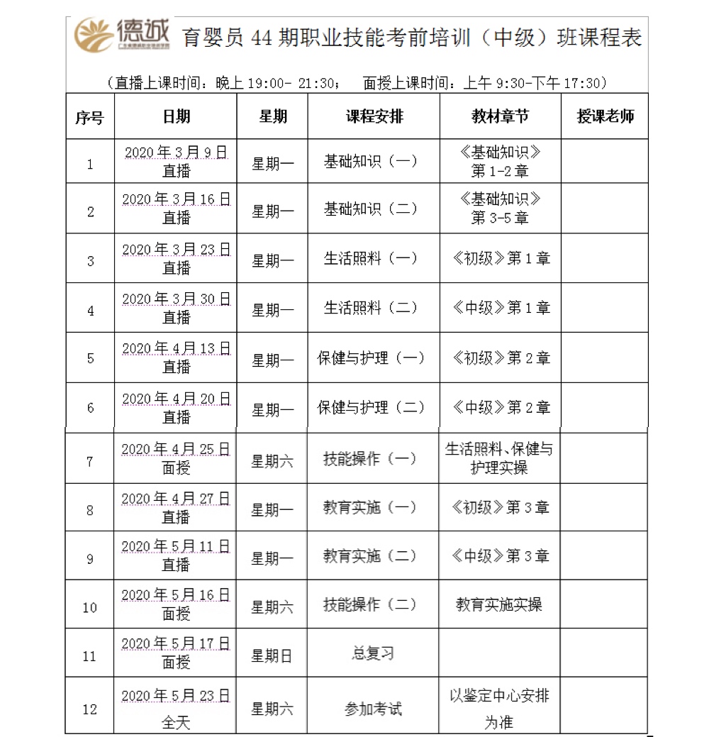 3.培訓時間:2020年3月9 日至5月17日;具體以課程安排表為準。直播上課時間:晚上19:00-21:40時(課間休息10分鐘,每次2.5小時),面授時間:上午9:00時-下午16:30時(中午休息1小時)。
