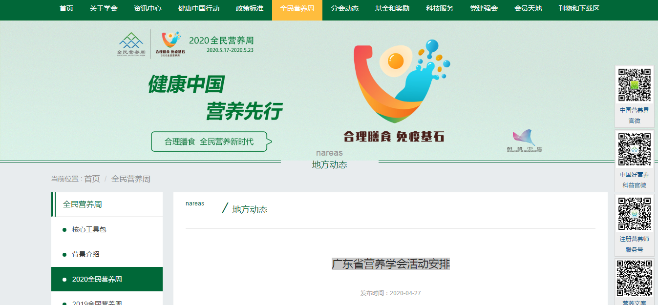 2015年,中國營養學會聯合中國疾病預防控制中心營養與健康所、農業部食物與營養發展研究所、中國科學院上海生命科學研究院營養科學研究所共同發起并確定,每年的5月第三周為“全民營養周”。