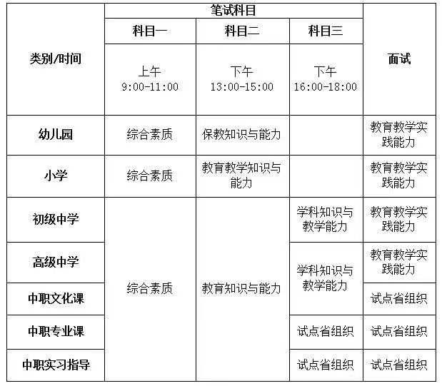 初級中學、普通高級中學教師和中等職業學校文化課教師資格考試筆試科目為《綜合素質》《教育知識與能力》《學科知識與教學能力》3科;