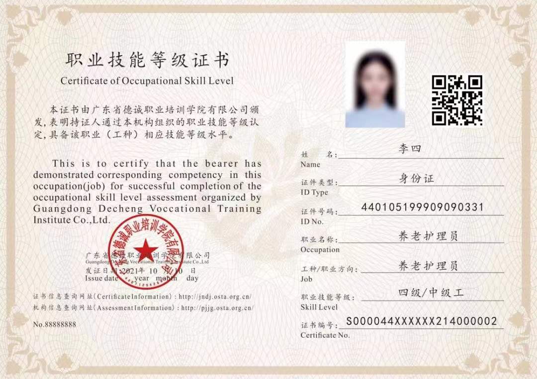 考核合格者,頒發廣東省德誠職業培訓學院有限公司簽章的“養老護理員職業技能等級證書”。該證書可以作為就業、升職、加薪等的憑證。