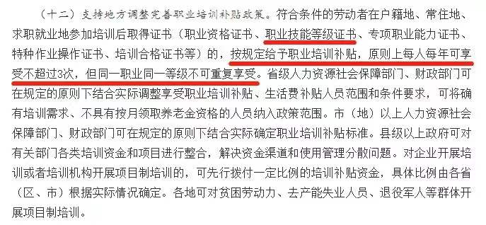 根據國家職業技能提升相關政策和《廣東省職業技能提升培訓補貼申領管理辦法》(粵人社規〔2019〕43號),符合條件的各類勞動者取得相應證書(包括廣東省核發的國家職業資格證書、職業技能等級證書,國家授權的行業主管部門核發的國家職業資格證書、國家技能等級證書,以及廣東省核發的、納入補貼范圍的專項職業能力證書、特種作業操作證書、培訓合格證書等),按規定可申領職業培訓補貼,同一勞動者一年內(自然年度)可申領三次技能提升補貼(含機構提供的免費培訓),但同一職業同一等級同一工種證書只能申領一次補貼,不得重復申領和重復享受。(政策如有變化,以最新政策為準)