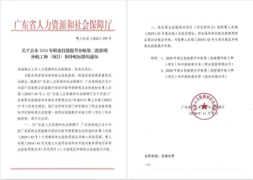 2.截選《關于公布2020年職業技能提升補貼第二批新增補貼工種(項目)和補貼標準的通知》粵人社函[2020]295號文