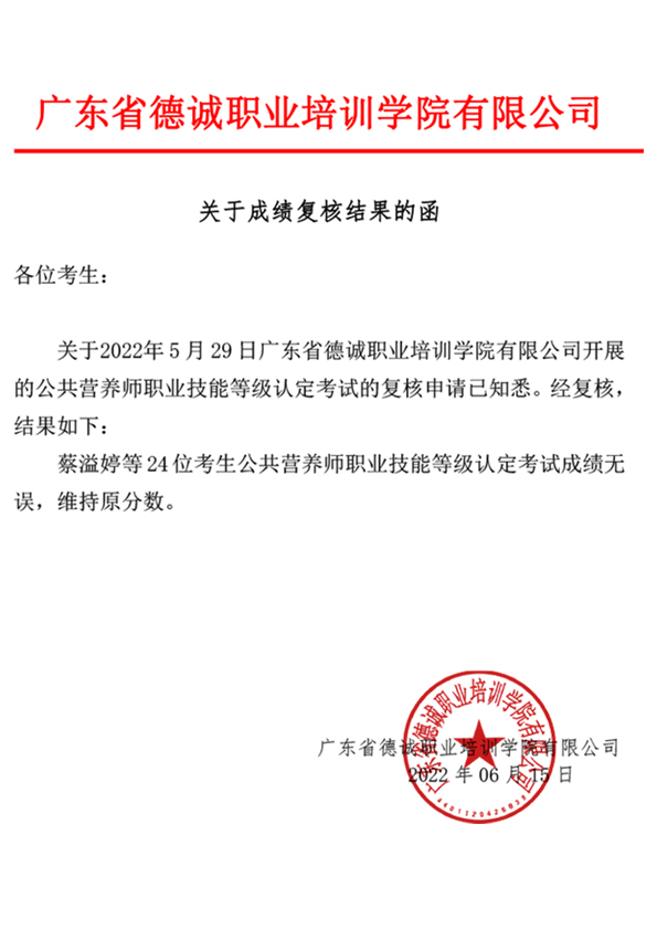 關于2022年5月29日公共營養師職業技能等級認定考試成績復核的函
