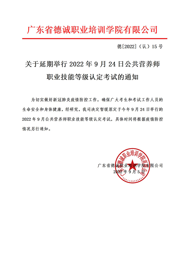 關于延期舉行2022年9月24日公共營養師職業技能等級認定考試的通知