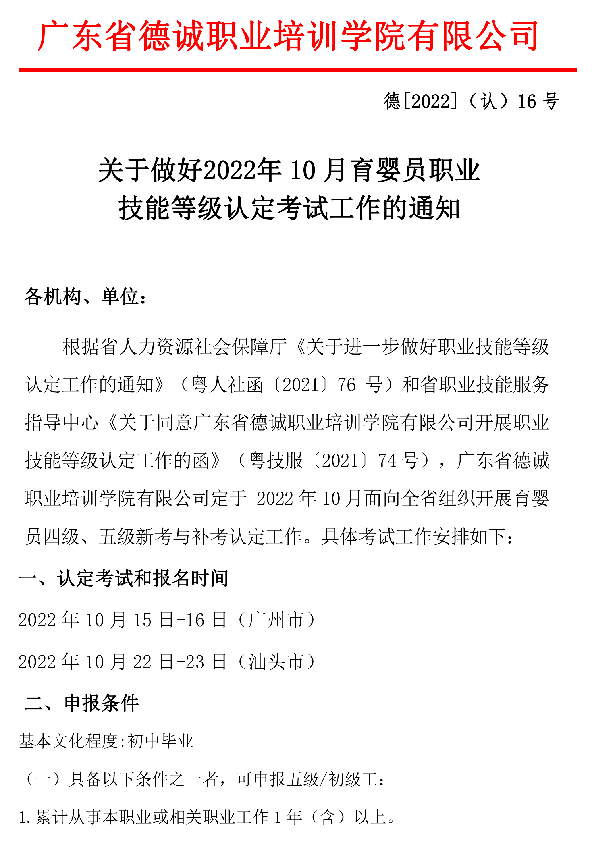 關于做好 2022年10月育嬰員職業技能等級認定考試工作的通知