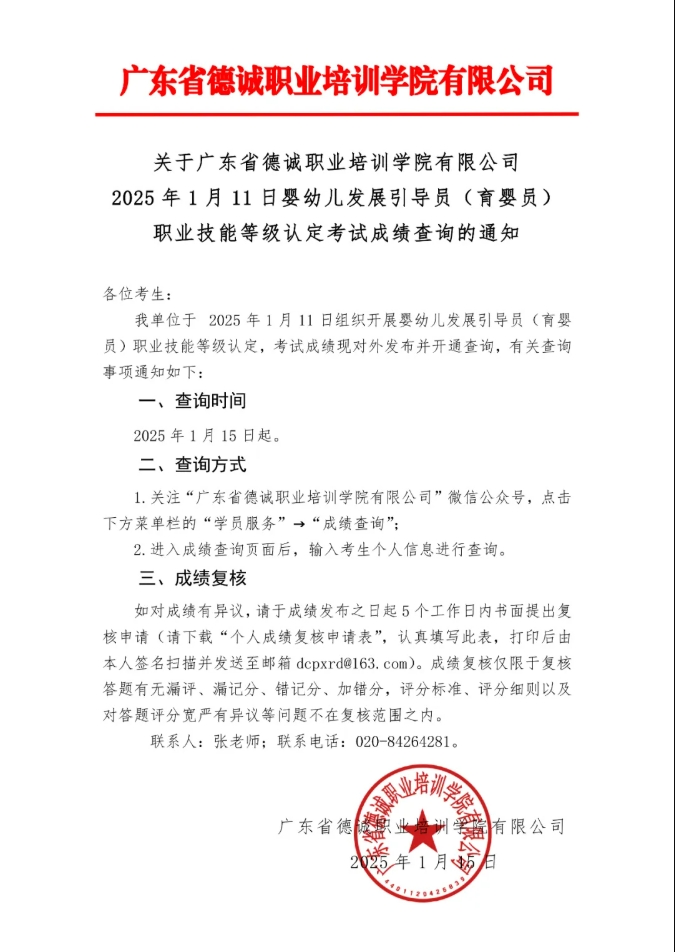 關于廣東省德誠職業(yè)培訓學院有限公司2025年1月11日嬰幼兒發(fā)展引導員(育嬰員)職業(yè)技能等級認定考試成績查詢的通知