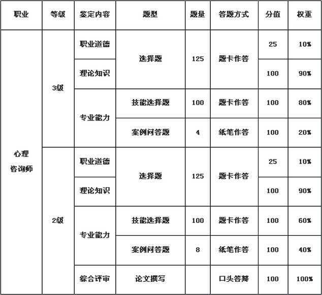 心理咨詢師職業資格認證考試是全國統考,考試分為心理咨詢師三級和二級,報名時間各地的都不相同,一般在各地職業資格鑒定指導中心進行報名,考試的具體內容如下:
